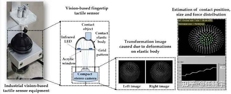 测量:在具体的测量原理中,由上图可以清楚可见:外界接触力会使得传感器的柔性外壳(elastic body)发生形变,从而带动柔性外壳内部所集成的的网格图案(grid pattern)发生形状与分布变化,再通过MEMS技术集成的微型双目相机(Stereo camera)记录相应的网格图案的图像和深度的变化,整体测量的数据流变化逻辑为:外力改变-柔性壳体发生形变-网格图案发生改变-根据标定读取外力大小与方向;