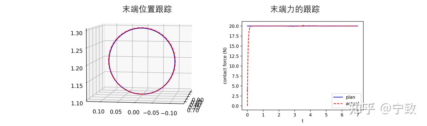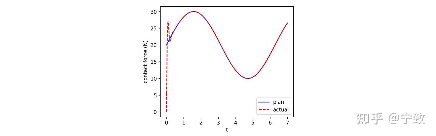 注意到,这里的接触没有考虑摩擦。事实上即使考虑摩擦,位置跟踪也可以较好实现(感兴趣可以试试)。实际上,本文的力控方法称作直接力控,在实际应用中并不常用也并不好用。更多用到的是阻抗控制或导纳控制。可以方便地处理各个方向上不同的控制表现。将在后续继续讨论。