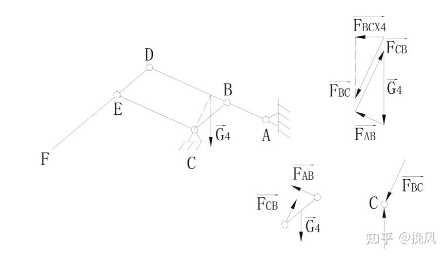 (3)CE杆自重G3,则CE杆异化为三力杆,DE异化为二力杆,BC杆仍为二力杆,受力三角形为下图,此时C铰链受BC杆分量和CE杆水平分量形成水平失衡力。