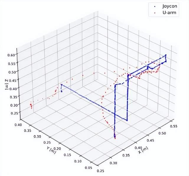 △手柄(蓝)与U-Arm(红)遥操作采样轨迹对比,主从臂架构能产生更自然的末端轨迹动作