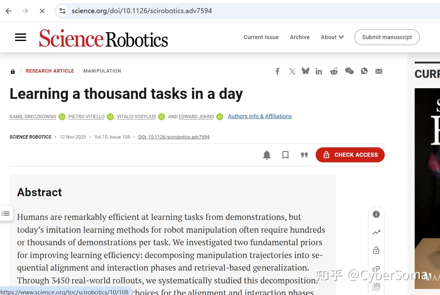 摘要:人类通过演示样本学习任务的效率极高,但如今用于机器人操作的模仿学习方法,每个任务通常需要数百或数千个演示样本。本研究探究了两种提升学习效率的核心先验知识:将操作轨迹分解为连续的对齐阶段与交互阶段,以及基于检索的泛化机制。通过 3450 次真实世界滚动实验,我们系统研究了这种分解方法。我们对比了对齐阶段和交互阶段的不同设计选择,并考察了其相对于当前主流的单阶段整体策略行为克隆范式的泛化性能与缩放趋势。在每个任务仅含少量演示样本(少于 10 个)的场景下,分解方法的 data efficiency 较单阶段学习提升了一个数量级,且在对齐阶段和交互阶段中,检索机制均持续优于行为克隆。基于这些发现,我们提出了多任务轨迹迁移(MT3)方法:一种基于分解与检索的模仿学习框架。MT3 仅需每个日常操作任务提供单个演示样本即可完成学习,同时还能泛化到此前未见过的物体实例。这种高效性使我们能在不到 24 小时的人类演示者时间内,教会机器人 1000 个不同的日常任务。通过额外 2200 次真实世界滚动实验,我们揭示了 MT3 在不同任务类别中的性能表现与局限性。