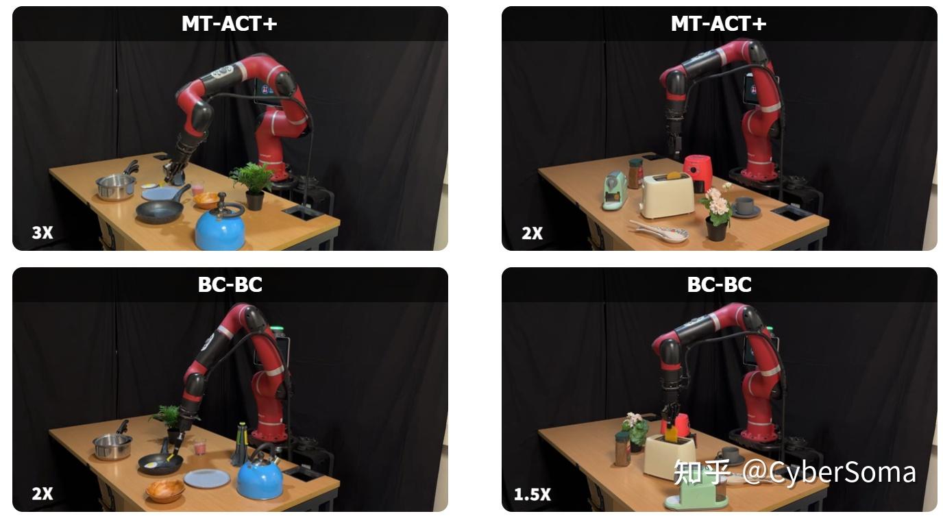 - MT-ACT+:在整个轨迹上训练的行为克隆策略。