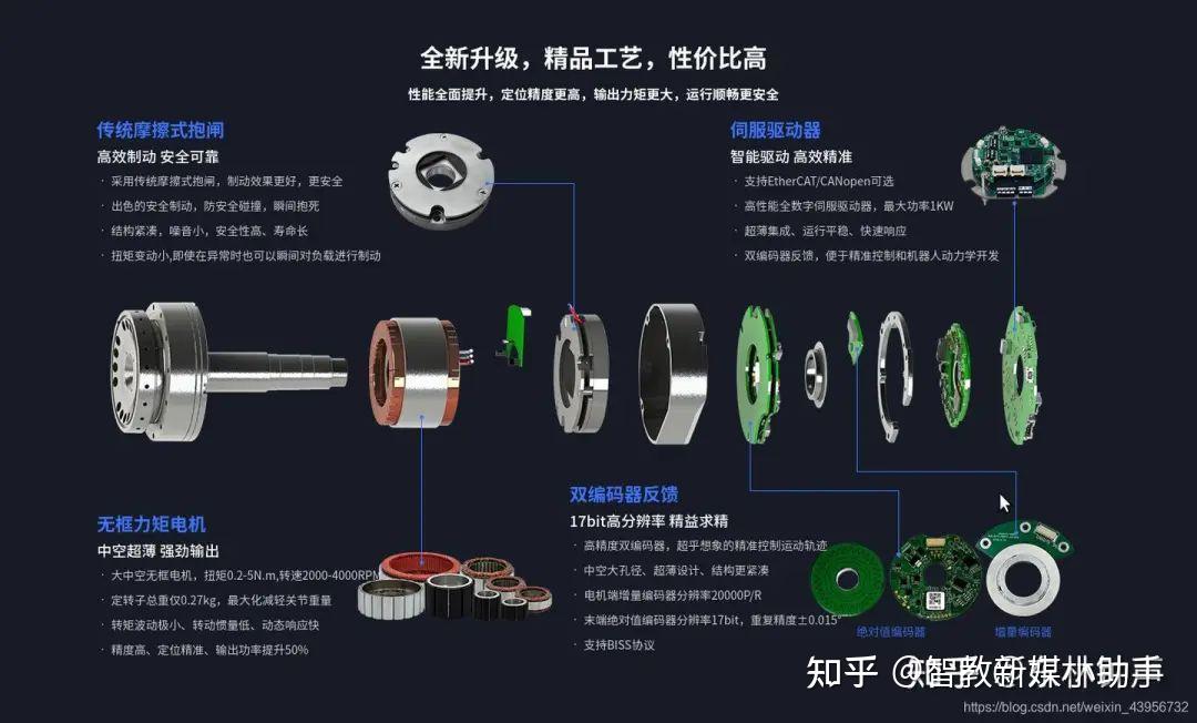 关节电机(本文主要讨论旋转类)一般会包含电机、驱动PCB板、减速器、编码器以及刹车(不全有)。如下图【1】: