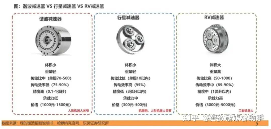 ▶ 减速器:一般常用的减速器有三种谐波 vs. RV vs. 行星齿轮。其实对于减速器来说,轻量级的机械臂一般常用就是谐波减速器或者行星减速器,谐波的特点是可以做到单级减速比大,但是比行星减速器贵,同时行星减速器(特别是标准型)的背隙通常比谐波减速器大得多。背隙可以类比日常生活中门铰链松动时门的晃动幅度,或者自行车链条松了踩下去车轮不动的间隙。在精密机械里,这种微小松动会直接影响定位精度。三种减速器的示意图如下(图中价格关注相对值):