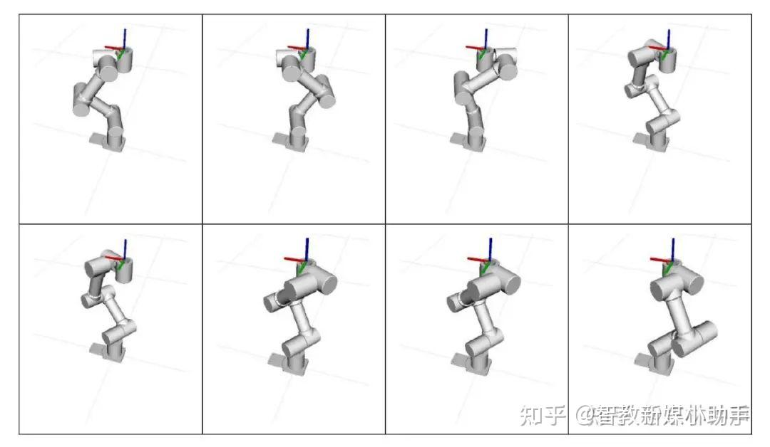 可以从上面看到一般六轴机械臂的一个未端姿态会对应几组不同的逆解。但是,这几组逆解在构形空间内是离散分布的,一般情况下无法在保证未端位姿的情况下从一组逆解变换到另一组逆解。换句话说,让机器人未端走一条固定轨迹,如果两个点中间存在一些不可通过的点(障碍物,奇异点之类),那么六轴机械臂是无法完成这条轨迹的【3】。