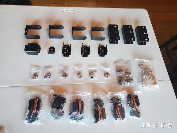 打开机械臂套件。将所有组件铺在桌子上。你应该有以下硬件部件: