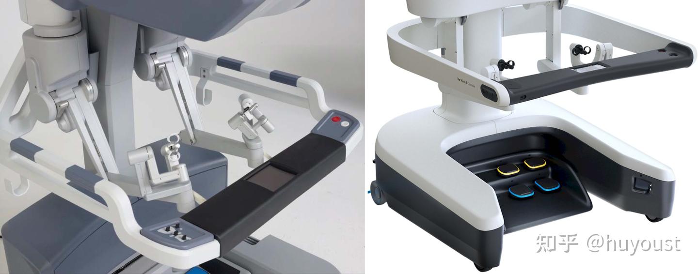 下面是Da Vinci Xi与Da Vinci 5的主操作手,国内的腹腔镜手术机器人基本上都是仿的Da Vinci Xi。Da Vinci 5的主操作手在第4,5连杆抛弃了直角的设计,改为了圆角,看上去更加圆润,但是这样的外观设计对于机械来说应该是不太友好的,尤其是电机选型与布局。而且Da Vinci 5的第三关节也抛弃了四连杆+电机远置的机构,看上去更加简洁了,这样的话第三关节的驱动电机可能就比较大。