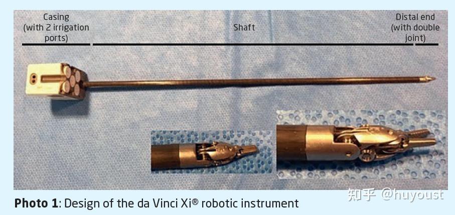 由于控制精度的要求,耗材中的传动绳要求很高,既要求足够软(最小弯曲半径足够小),也要求受力后的弹性形变足够小(弹性模量够大)。能同时直接满足这两个要求是很难的,对材料的要求很高。可能是出于材料技术与成本的考虑,达芬奇手术器械中,并不是用的一整根的钢丝绳,中间黑色的套管内其实是小钢管(钢管没有多股编织,不存在编织间隙,刚度比钢丝绳好很多),钢管两头与钢丝绳固定,这样组合实现既“软”又“硬”的效果。当然,耗材的结构设计还有很多其它的考量与细节,从机械的角度看,肯定是一件艺术品。