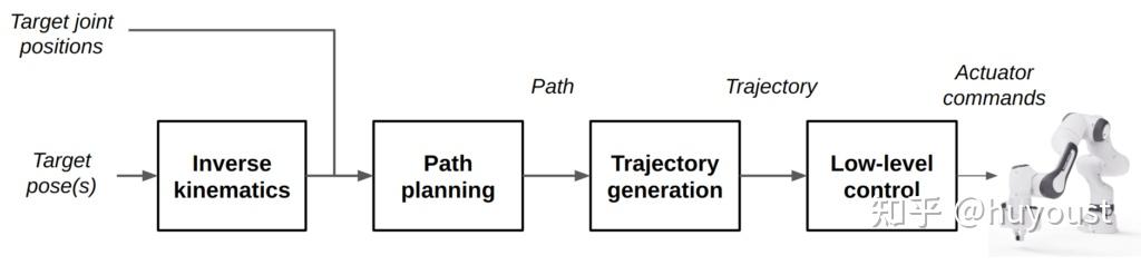 - 轨迹生成:将路径转换为基于时间的轨迹,以供低级控制器执行。虽然轨迹生成传统上用于对规划器输出的路径进行“时间参数化”,但路径规划和轨迹生成也很常见。例如,轨迹优化方法可以直接返回在上述约束下达到参考姿态的轨迹。此外,它还可以包括时间方面引入的新约束,如最大速度、加速度、扭矩等。