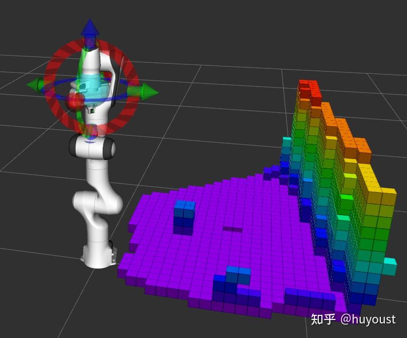我们还需要讨论与环境的碰撞检查。确实,我们还可以使用几何图元和网格来表示机器人周围的世界。如果我们先验地知道环境是什么样子的(例如,机器人在工业工作单元中),或者我们有一种机制来检测物体并适应它们周围的形状(如盒子),那么这是可行的。但是,您也可以直接使用传感器数据将整个环境视为障碍物。一种常见的方法是将深度相机和/或激光雷达的点云转换为易于碰撞检查的表示。许多软件库支持的一种格式是Octomap,它只是在软件中表示体素网格的一种更有效的方法。