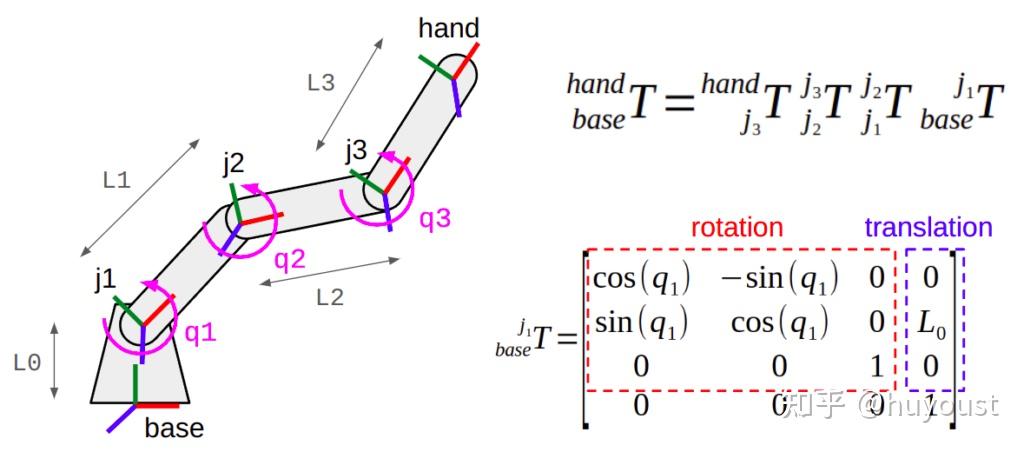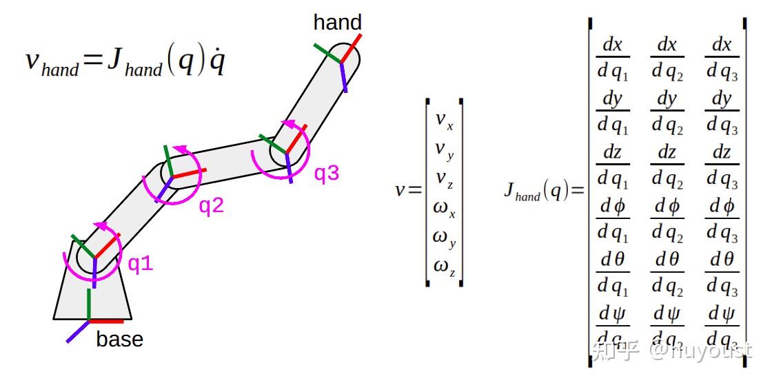 表达这些关系的一般方法是通过一个名为几何雅可比矩阵的矩阵。雅可比矩阵在机器人运动规划和控制的几个应用中至关重要。这包括反向运动学、遥操作(或伺服)、低级位置和力控制,甚至在路径规划和轨迹生成中强制执行任务空间和碰撞约束。这就是为什么我写了这么多关于他们的文章,以及为什么这不会是他们最后一次出现在这篇文章中。