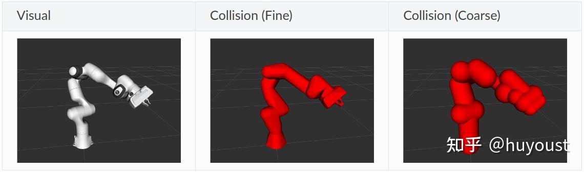 大多数现代碰撞检查库,如灵活碰撞库(FCL),都可以用于执行这些计算。碰撞几何体可以表示为简单的图元(球体、圆柱体、长方体等)或直接来自CAD模型的网格。这带来了一种权衡:虽然与网格相比,几何图元之间的碰撞计算成本相对较低,但它们是机器人真实几何形状的近似值。通常,机器人建模框架在视觉几何(用于可视化机器人的全分辨率网格)和碰撞几何(简单图元和粗略碰撞网格的组合)之间有区别。如果你想了解更多,我建议你看看2012年国际放射防护协会上发表的FCL官方论文。