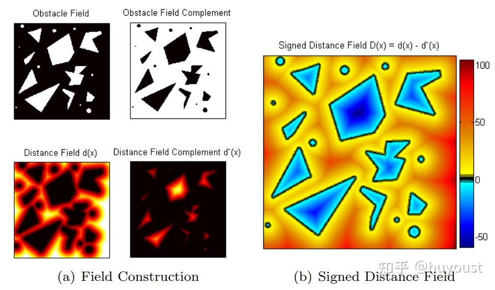 在运动规划中使用的另一种相关表示,在计算机图形学和游戏开发中也很常见,是有符号距离函数或有符号距离场(无论哪种方式,它都缩写为SDF)。顾名思义,SDF返回一个距离值,如果几何体没有碰撞,则该值为正,如果它们发生碰撞,则为负,零就在边缘。这些可以是简单图元的分析函数,但通常的做法是从更复杂的形状(网格、Octomaps等)离线生成SDF,并将其存储在内存中,以便在运行时快速查找。对于SDF的基本介绍,我喜欢这个YouTube解释器。更接近我们的机器人应用程序,你会发现像MuJoCo和nvblox这样的最先进的软件工具支持SDF。