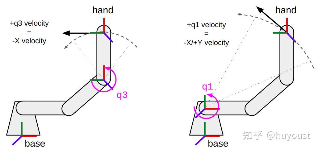 - 在左侧,你可以看到以正速度旋转第三个关节将导致手部沿着一条弧线移动,该弧线在特定位置的切线恰好沿着基架中的-X方向(或手部框架中的+Y方向)。