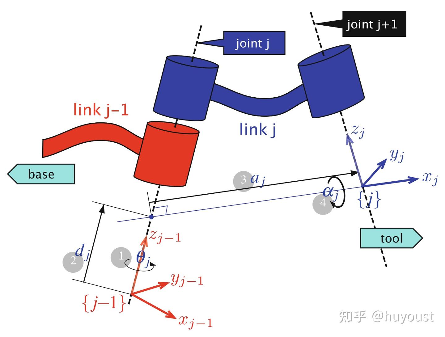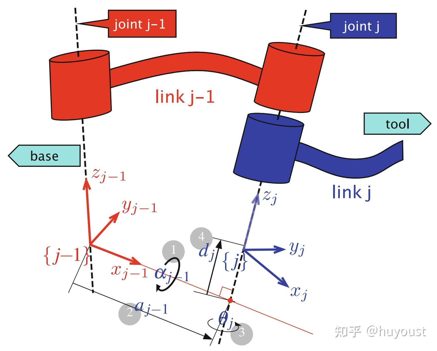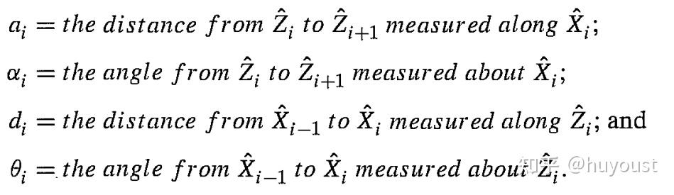 Craig-MDH参数法用四个参数来描述相邻坐标系的关系,需要注意的是下图中参数的下标: