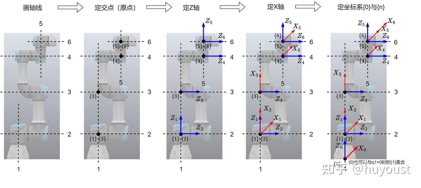 这里实际上也隐藏了一个细节,那就是选择用于建坐标系的姿态,通常都是选择机械臂的关节角为零位时建立坐标系,但是这个不是强制要求的。如果建立坐标系时机械臂的关节不在零位,那么实际分析时给关节变量减去/加上偏置量即可。