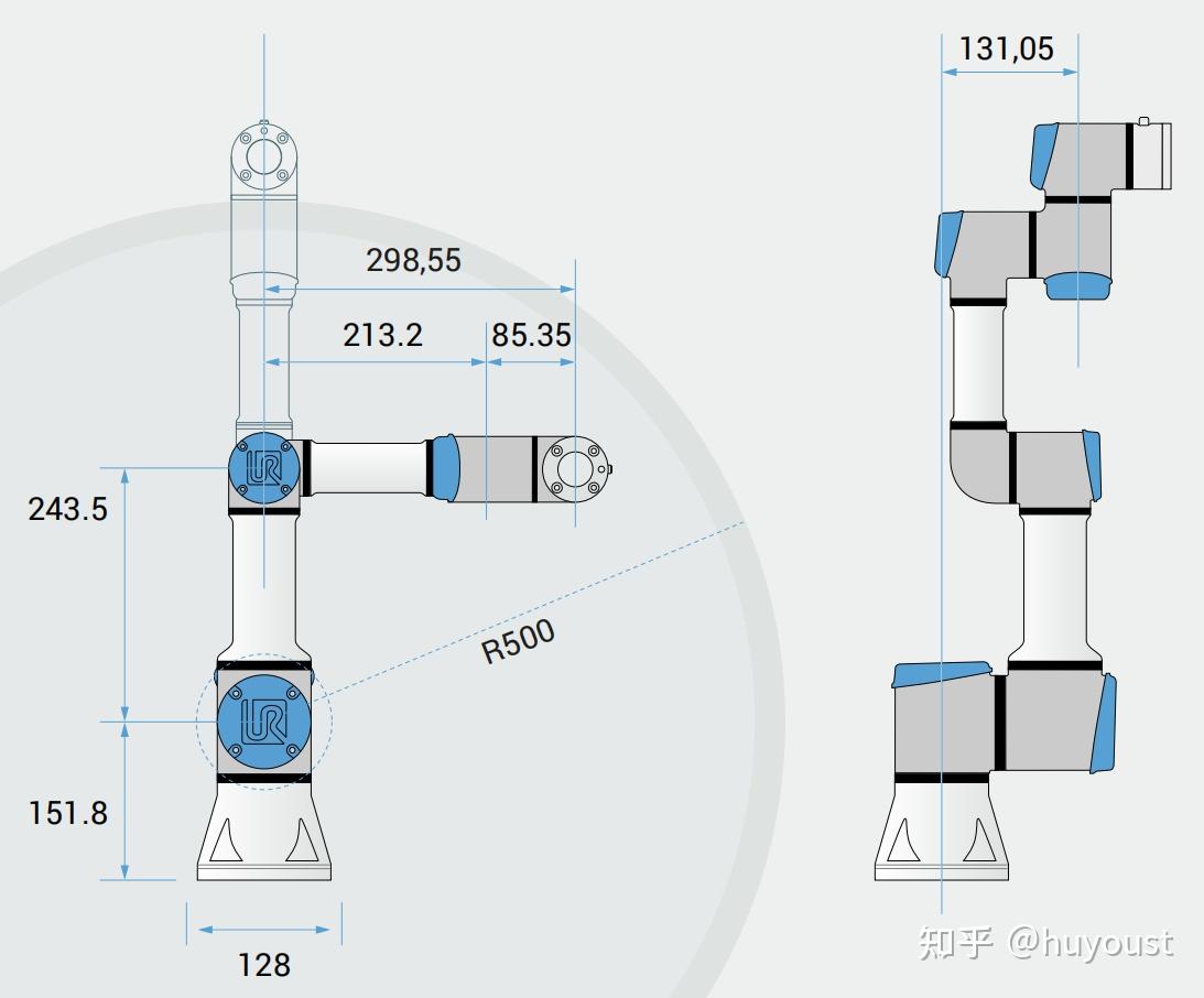 此处还是以UR3e机械臂作为例子介绍,关于UR3e机械臂的相关资料可以参考官网,其主要尺寸如下: