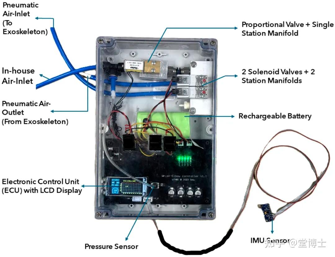 要让外骨骼稳定工作,精准的控制系统必不可少。PASE配备了一个专门的气动控制箱,内部集成了两个电磁阀、双工位歧管与单工位比例阀,前者负责引导气流方向,后者则能精确调节压力,确保输出力量符合任务需求。控制箱内的压力传感器会实时监测气压变化,微处理器则根据传感器数据实时调整,形成闭环控制。系统初始使用50PSI的内部压缩空气,先调节至25PSI,再根据反馈进一步降至18PSI的工作压力,一旦达到预设值便自动停止充气,既保证了辅助力度,又避免了压力过高带来的安全隐患。在测试阶段,为了专注评估机械辅助效果,研究团队还特意将控制系统与用户隔离,采用人工充气方式,暂时忽略了设备自身重量对实验结果的影响。