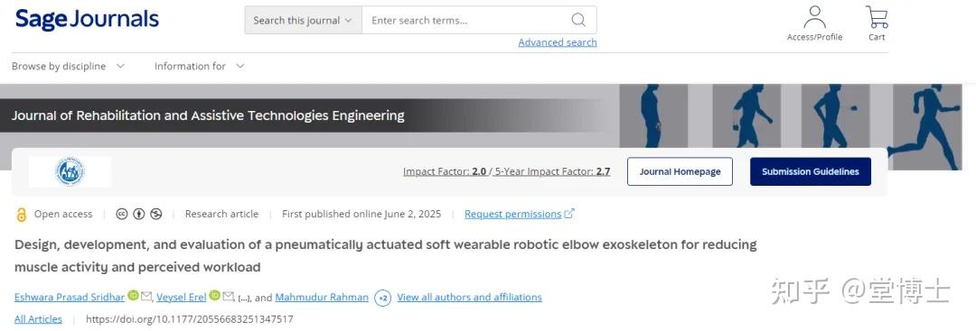 前不久,该研究成果的相关论文已以“Design, development, and evaluation of a pneumatically actuated soft wearable robotic elbow exoskeleton for reducing muscle activity and perceived workload”为题在《SAGE Journals》上进行发表。