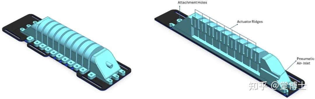 而PASE的制造工艺也经过了精心打磨。硅胶执行器的生产分两步进行,先成型脊状结构,再打造底座,最终形成一个可均匀膨胀的空腔,确保充气时能稳定输出力量;Onyx底板通过3D打印实现精准塑形,氯丁橡胶织物则按底板尺寸精确裁剪、对齐孔位,最后将三者缝合组装,形成完整的执行器组件。为了进一步优化性能,研究团队还运用有限元分析(FEA),模拟执行器在不同工作场景下的受力与运动状态,提前发现并解决潜在设计缺陷,让设备的力传递效率与运动支撑效果达到最佳。
