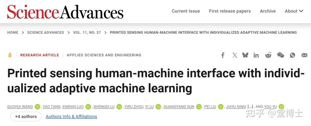 该成果以“Printed sensing human-machine interface withindividualized adaptive machine learning”为题,发表在顶级期刊《Science Advances》上。