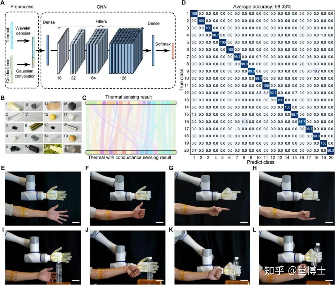 压力传感器采用创新的电容式设计,灵敏度高达10.5 pF/kPa,并在连续2000次测试中保持稳定性能。热导率和电导率传感的组合使机器人能够区分不同材料的物体,识别准确率从单独使用热导率时的63.99%提升至98.03%。