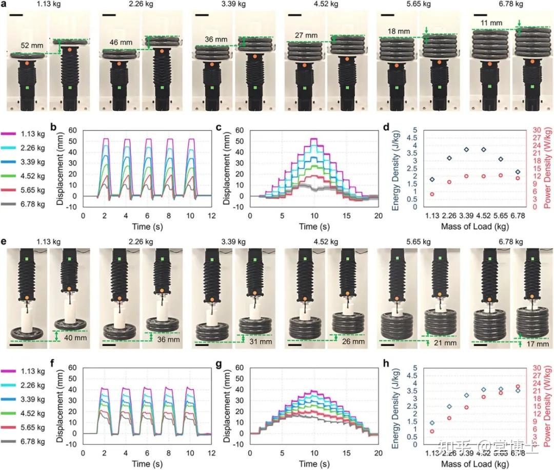 值得一提的是,团队采用手机壳常用的廉价橡胶(热塑性聚氨酯TPU)3D 打印 HSA轴和吉村折纸波纹管,降低了成本且保证了材料的机械顺应性、变形性和坚固性。每块人造肌肉重量约与足球相当,比一罐苏打水略大,可拉伸至自身长度的30%,能收缩并提起比自身重 17 倍的物体,且由电池供电,无需外部重型设备。