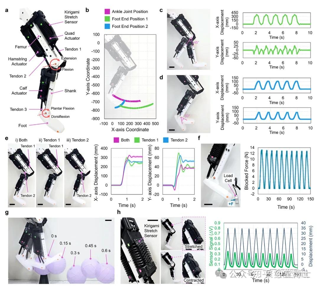 为展示人造肌肉的实际潜力,团队用3D 打印构建了真人大小的机器人腿。该腿以硬质塑料为 “骨骼”,搭配橡胶制成的类肌腱连接器,弹性肌腱将 “股四头肌”“腘绳肌” 与 “小腿骨”、“小腿肌肉” 与足部结构相连,能像生物肌肉骨骼系统一样抑制运动、吸收冲击。此外,团队还为机器人腿添加了灵活的3D打印传感器,使其能检测自身运动。该传感器呈三明治结构,两层非导电层中间夹着导电柔性塑料,当人造肌肉移动时,传感器电阻变化,让机器人感知肌肉的伸展或收缩程度。