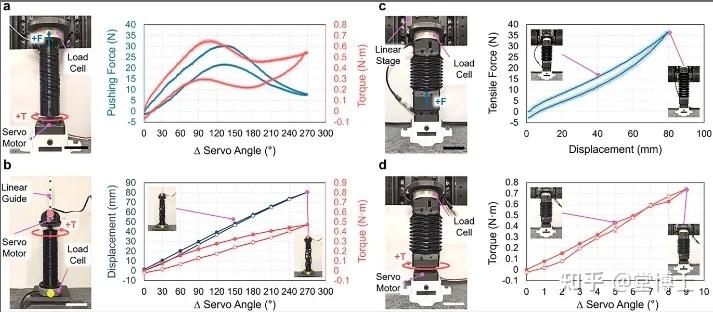基于这种仿生设计理念,研究团队研发出了新型人造肌肉。在此次研发中,团队以特鲁比实验室此前开发的“手动剪切辅助剂”(HSA)为核心。HSA 是一种 3D 打印的圆柱形结构,具备复杂结构,可在扭曲时实现伸展和膨胀等独特运动,这种特性为其模拟肌肉的收缩和伸展提供了基础。团队将HSA 封装在橡胶折纸波纹管结构中,使旋转电机能驱动该结构作为执行器伸展和收缩,从而让其像肌肉一样以强大力量推拉,甚至能在启动时动态僵硬,与人体肌肉特性相似。