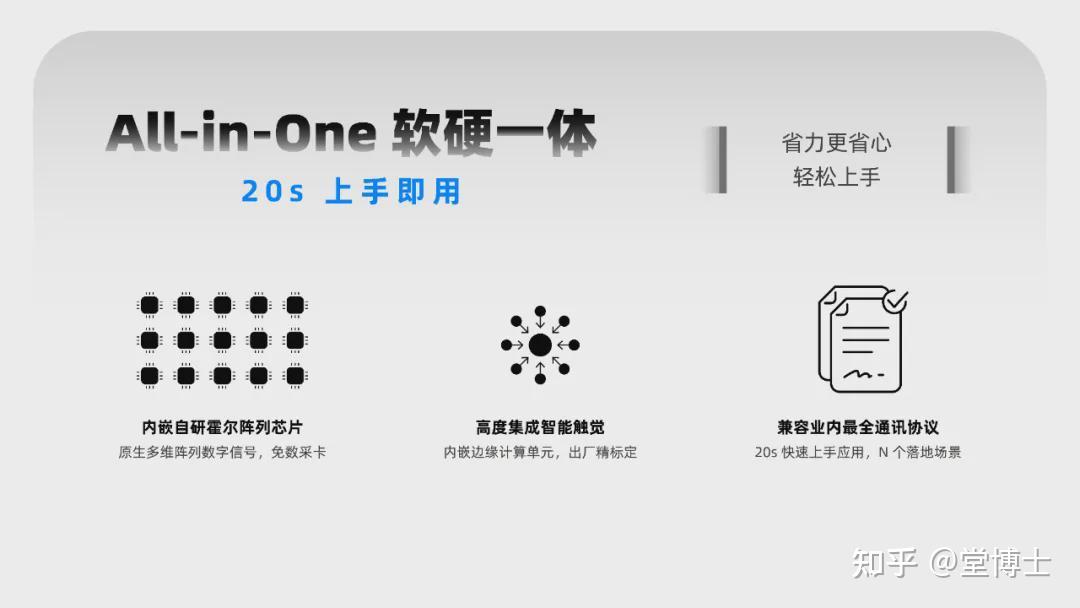 在易用性方面,GEN3采用高度集成的智能触觉设计,内嵌了边缘计算单元,出厂即配备精标定。这种“即买即用”的设计理念,使用户无需进行复杂的二次开发及复杂繁琐的标定工作。而兼容业内最全的通讯协议设计,可使用户在20秒内快速上手应用,极大地缩短了开发周期,加速其在 N 个实际场景的快速部署。