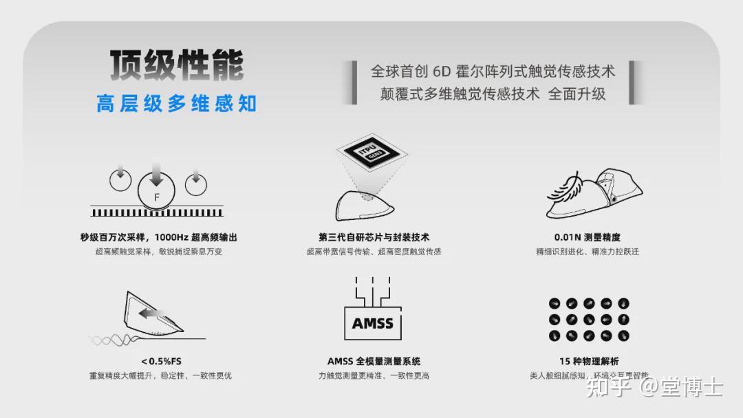 依托全球首创的6D霍尔阵列式触觉传感技术深厚积累,帕西尼多维触觉传感器 GEN3 采用第三代自研芯片及封装技术,与AMSS全模量测量系统,能以每秒数百万次的高频率对多层嵌套磁场阵列分布进行高精度采集,经传感器内封装的非线性力学反演算法处理,最终以极高可靠性与1000Hz 频率输出六维力(三维力+三维力矩)、力分布、材质、温度、回弹等15种触觉感知信息,并以0.01N的精细力识别能力与惊人的全量程<0.5%FS级重复精度,为具身智能体提供业内顶尖的类人般丰富细腻、稳定可靠的触觉交互信息。