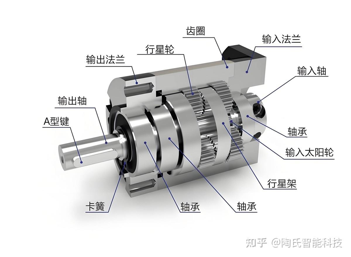 工作原理:行星减速器基于齿轮传动原理,其结构包括太阳轮、行星轮、内齿圈和行星架。太阳轮与电机连接,行星轮围绕太阳轮转动,通过行星架传递扭矩。结构简单且传动效率高,多安装在伺服电机上,用来降低转速,提升扭矩,精确定位,其常被用于机器人中对精度要求低的部分身体旋转关节。