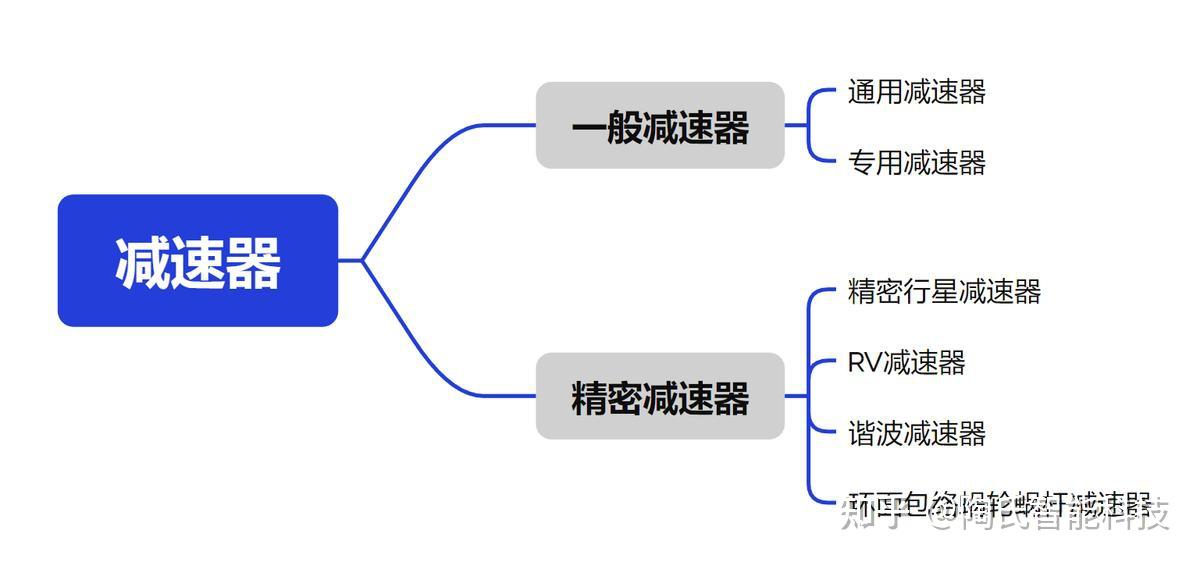 减速器可根据精度划分为一般传动减速器和精密减速器两大类。其中一般传动减速器又可细分为通用减速器和专用减速器,而精密减速器则包括精密行星减速器、谐波减速器、RV减速器、环面包络蜗轮蜗杆减速器等。