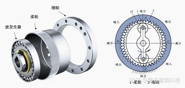 谐波减速器的工作原理十分独特而高效。其核心部件之一——波形发生器,呈椭圆形,与电机轴紧密连接。通过其精巧的椭圆形轮毂和特制的薄壁轴承,波形发生器能够产生可控的弹性变形波。这些变形波随后被传递到柔轮,促使柔轮与刚轮之间进行动态相互作用,从而实现减速并有效增加输出扭矩。在这个过程中,刚轮的齿数设计上略大于柔轮的齿数,这一少齿差的啮合设计使得谐波减速器在保持小体积和轻重量的同时,依然能够实现显著的传动比。