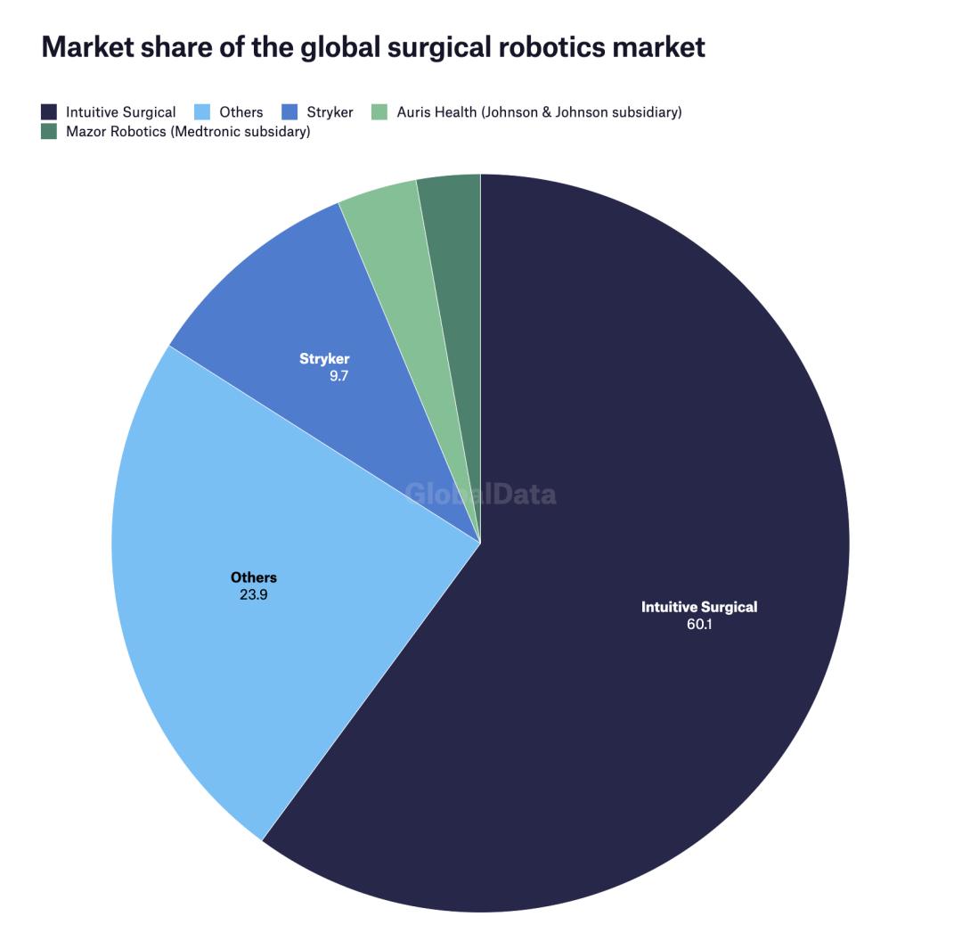 其他的国际竞争者,只有史赛克(Stryker)能占到近1成,美敦力(Medtronic)的Mazor Robotics和强生(Johnson & Johnson)的Auris Health也有自己的手术机器人产品,但市场份额不均不超过5%。