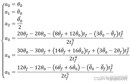 此时,还缺少2个约束条件。由于机械臂进行的是点对点运动,机械臂的各关节角速度在t_0 与t_f 时刻均为0,可表示为