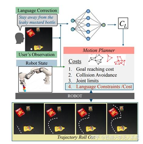 LLM同样被用于机器人规划中的实时校正,修正可以采取新的优化函数、新的约束(例如避免特定对象)或规划算法提示(例如访问特定航路点)的形式[4]。以机器人吸尘器为例,机器人的目标是打扫房子,但可能需要改变目标(“只打扫客厅。”),引入限制(“不要进入浴室!”)或在机器人被卡住时引导它(“走到墙的右端进入错过的房间。”),自然语言反馈以改变其行为的各个方面或修改其运动目标。